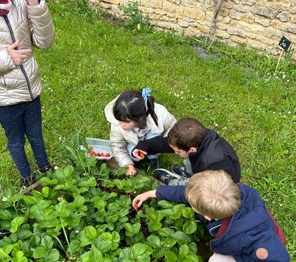 Les élèves de MS-GS de maîtresse Camille sont allés ramasser les fraises et les framboises dans le jardin. Ils ont mangé toutes les framboises mais ont gentiment offert les grosses fraises à déguster aux élèves de TPS-PS de maîtresse Sandra.